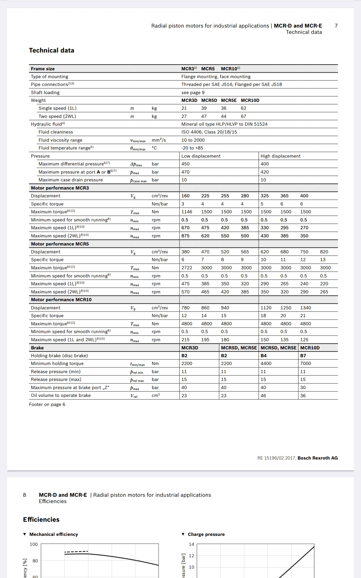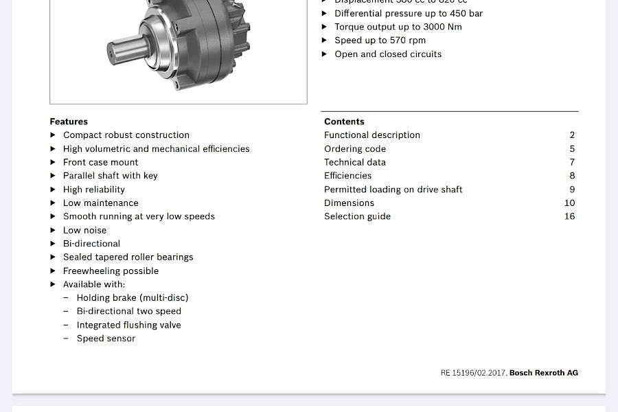 Iskutilavuudeltaan 160cm3/kierros-1340cm3/kierros. Paine-ero on jopa 450 bar, vääntömomentti jopa 4800 Nm ja nopeudt jopa 875 rpm. Katso lisätietoja ''Tekniset tiedot''-välilihdeltä.