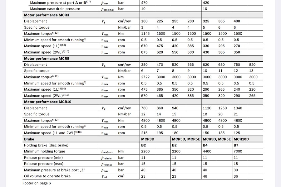 Iskutilavuudeltaan 160cm3/kierros-1340cm3/kierros. Paine-ero on jopa 450 bar, vääntömomentti jopa 4800 Nm ja nopeudt jopa 875 rpm. Katso lisätietoja ''Tekniset tiedot''-välilihdeltä.